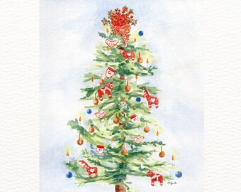 Swedish Christmas Tree Watercolor Painting: Holiday Wall Art, 16x20