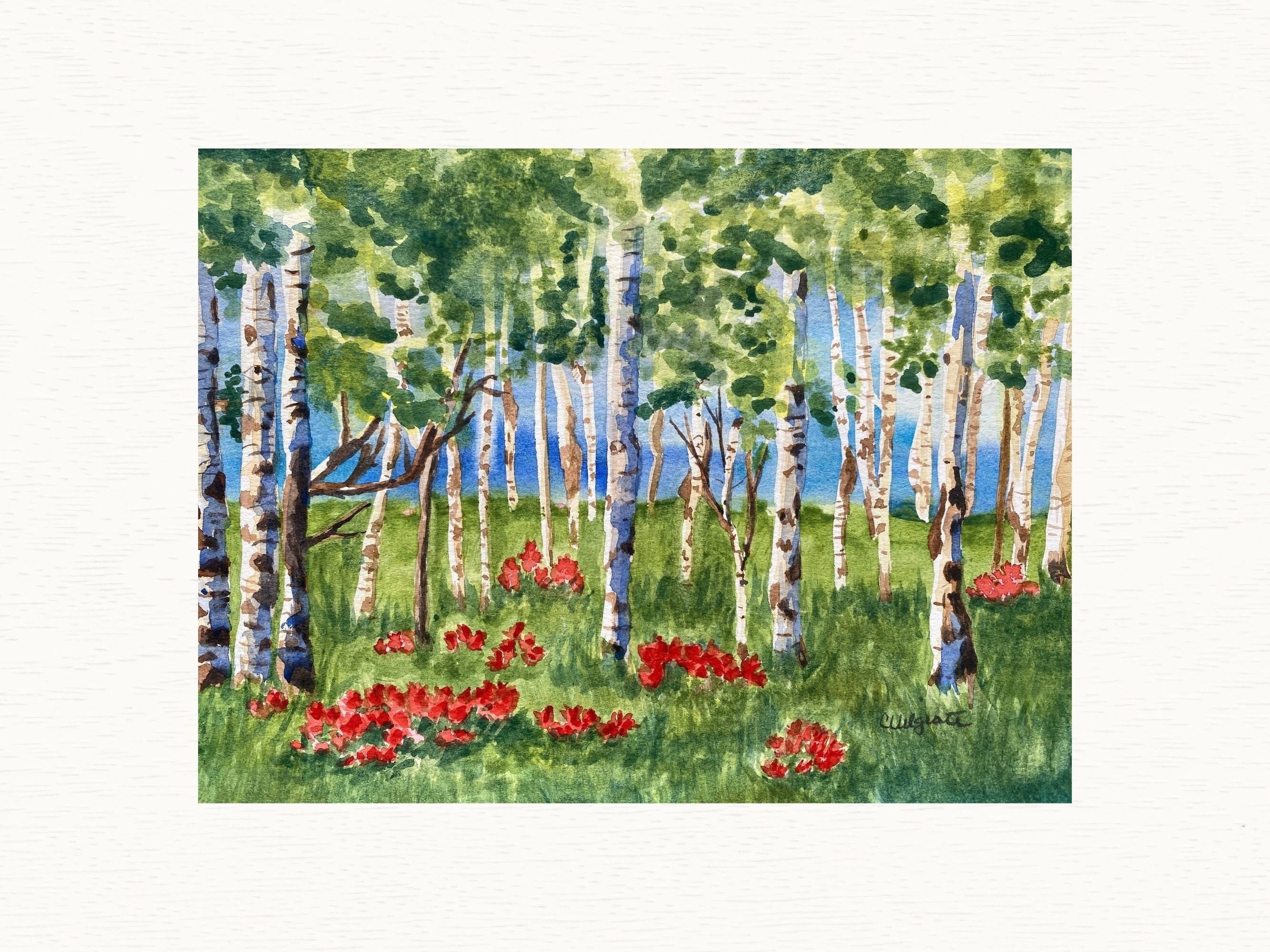 This is a reproduction of my original watercolor painting of aspens in the spring. These trees are growing in a meadow filled with red Indian paintbrush wildflowers.