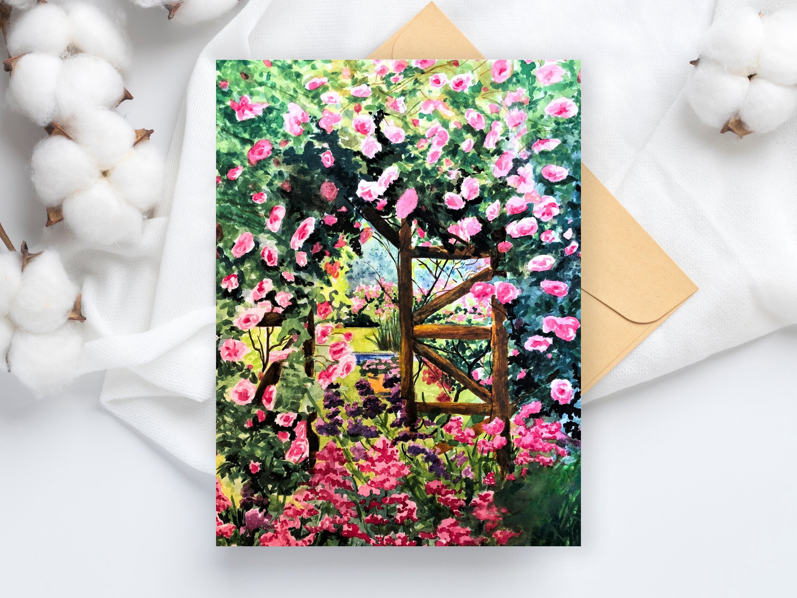 This is a folded card made from my original Rose Garden Arbor watercolor painting. These cards are 5x7 in., 4.25x5.5 in., and 4x6 in. Postcards. The art cards come with a white or brown envelope. These watercolor greeting cards are blank inside for your own special message. The artwork is vertical. The postcard is 4x6 in with lines and printing on the backside.