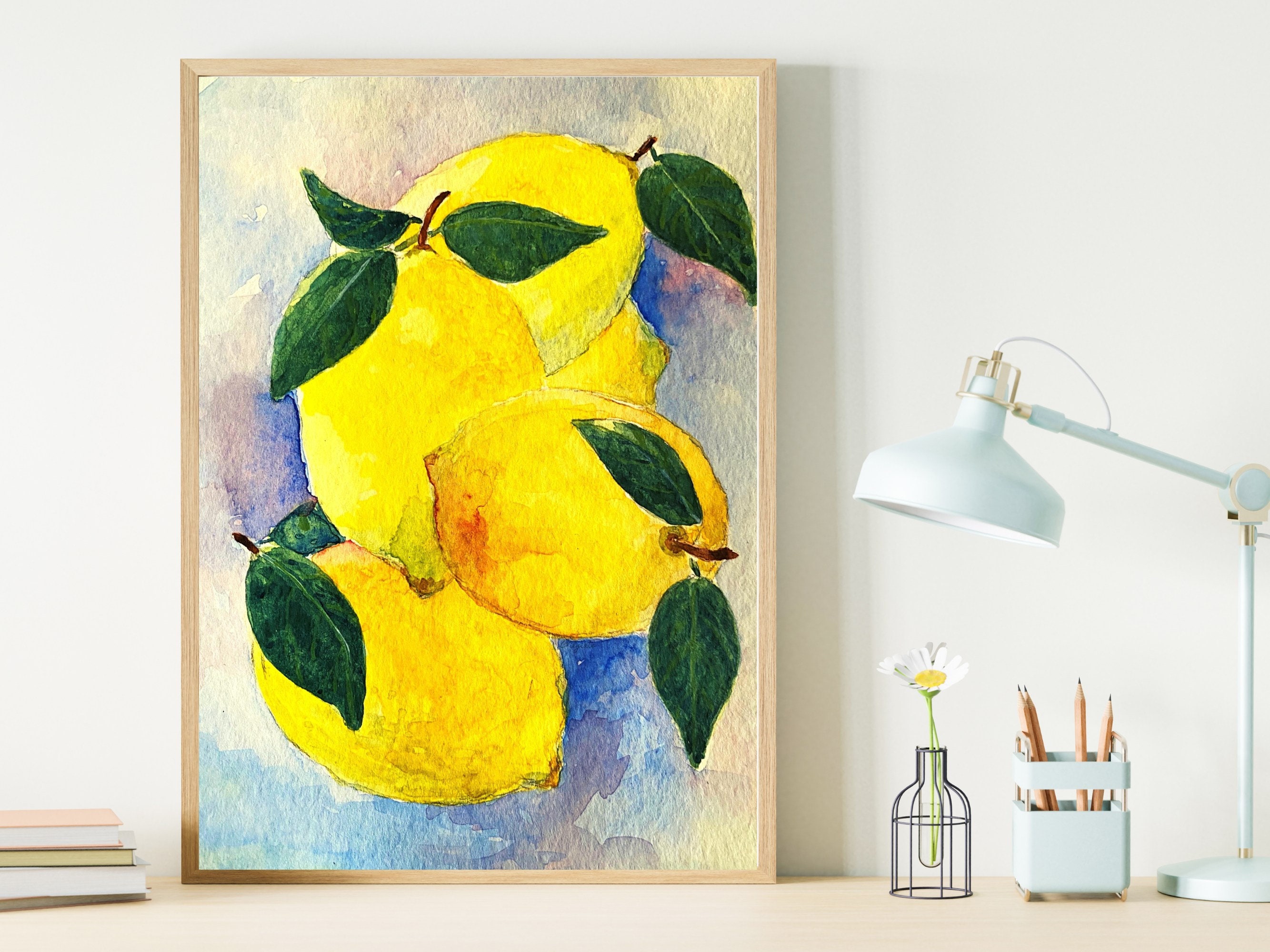 Large art print from my original watercolor painting of five yellow lemons titled - "Lots of Lemons" This fruit wall art is 16x20 in. This beautiful, large art will be a great addition above a side table on a living room wall. It will add cheer and color to your kitchen. It will be great on a bathroom wall as well.