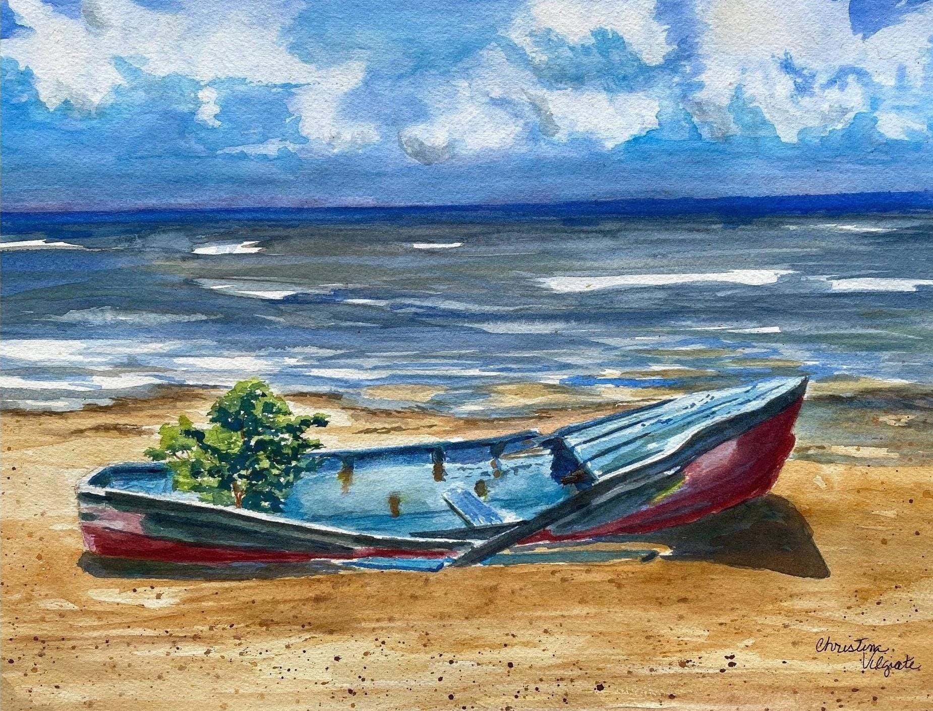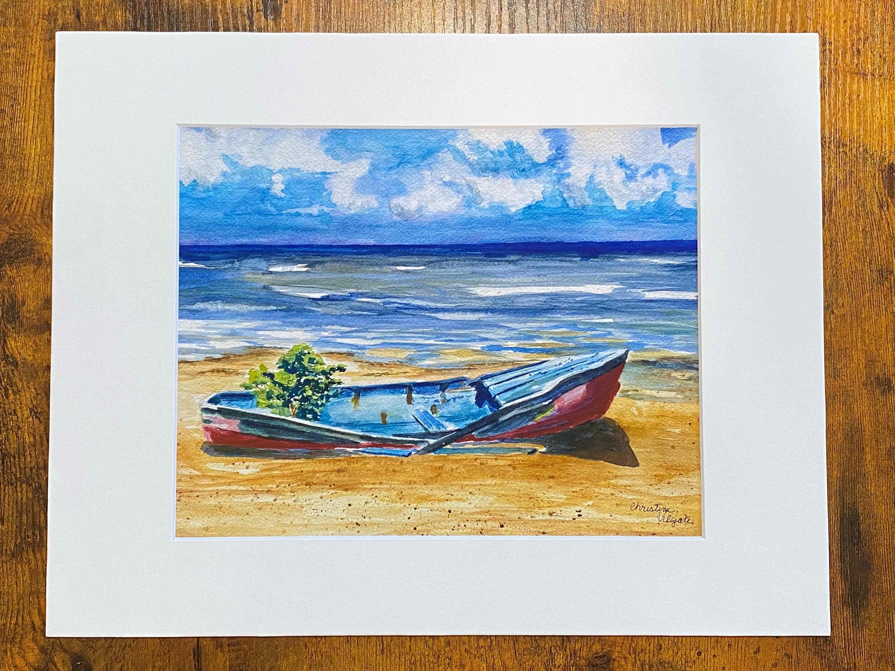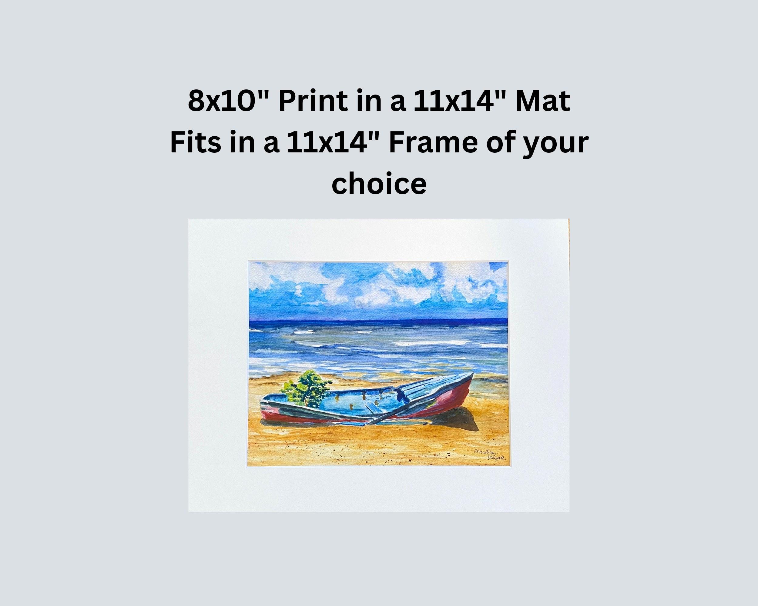 This listing is for a matted 8x10 Art Print. It is printed from my original watercolor painting titled ' Blue Boat in Belize'. This art will fit conveniently into an 11x14" frame of your choice.