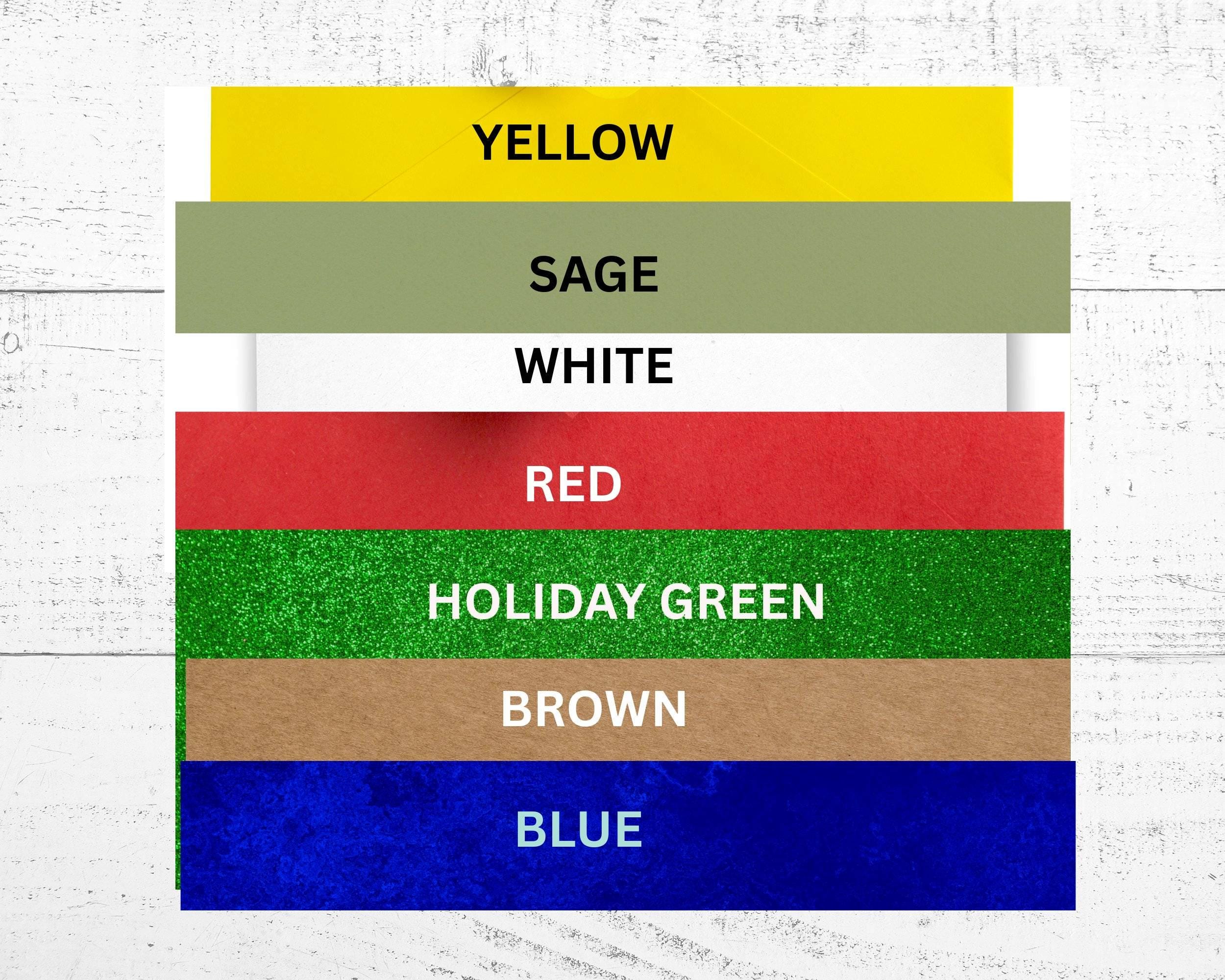 Color choices for envelopes are white, red, sage, yellow, brown holiday green or royal blue.