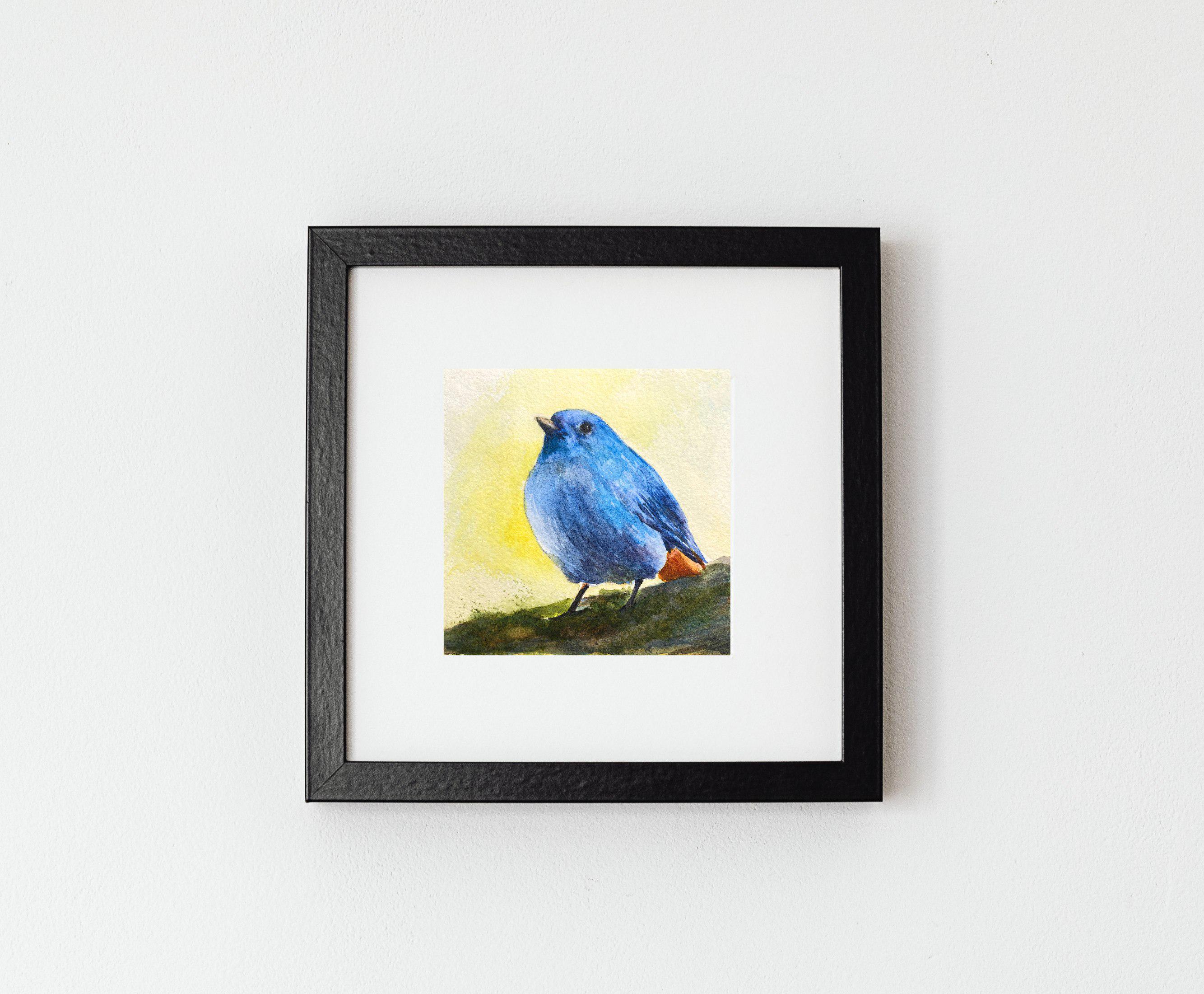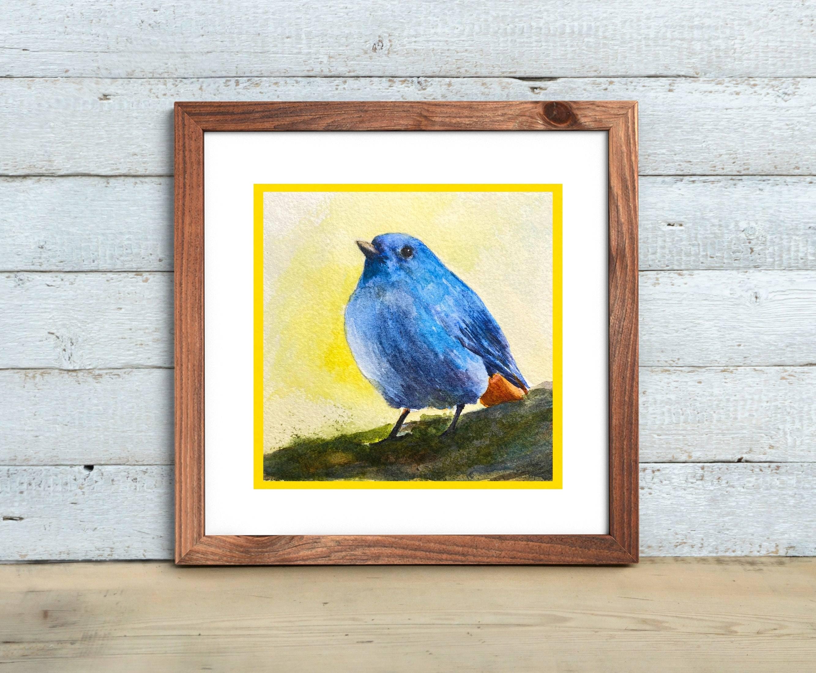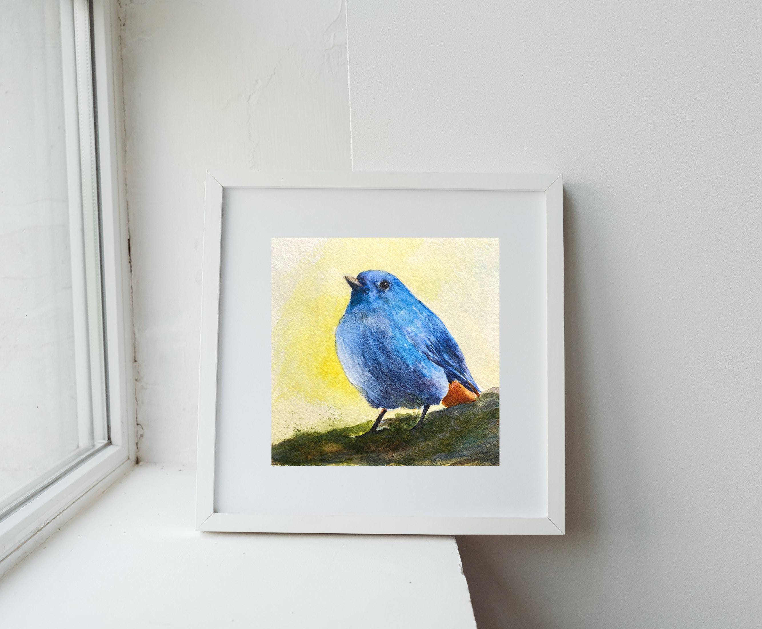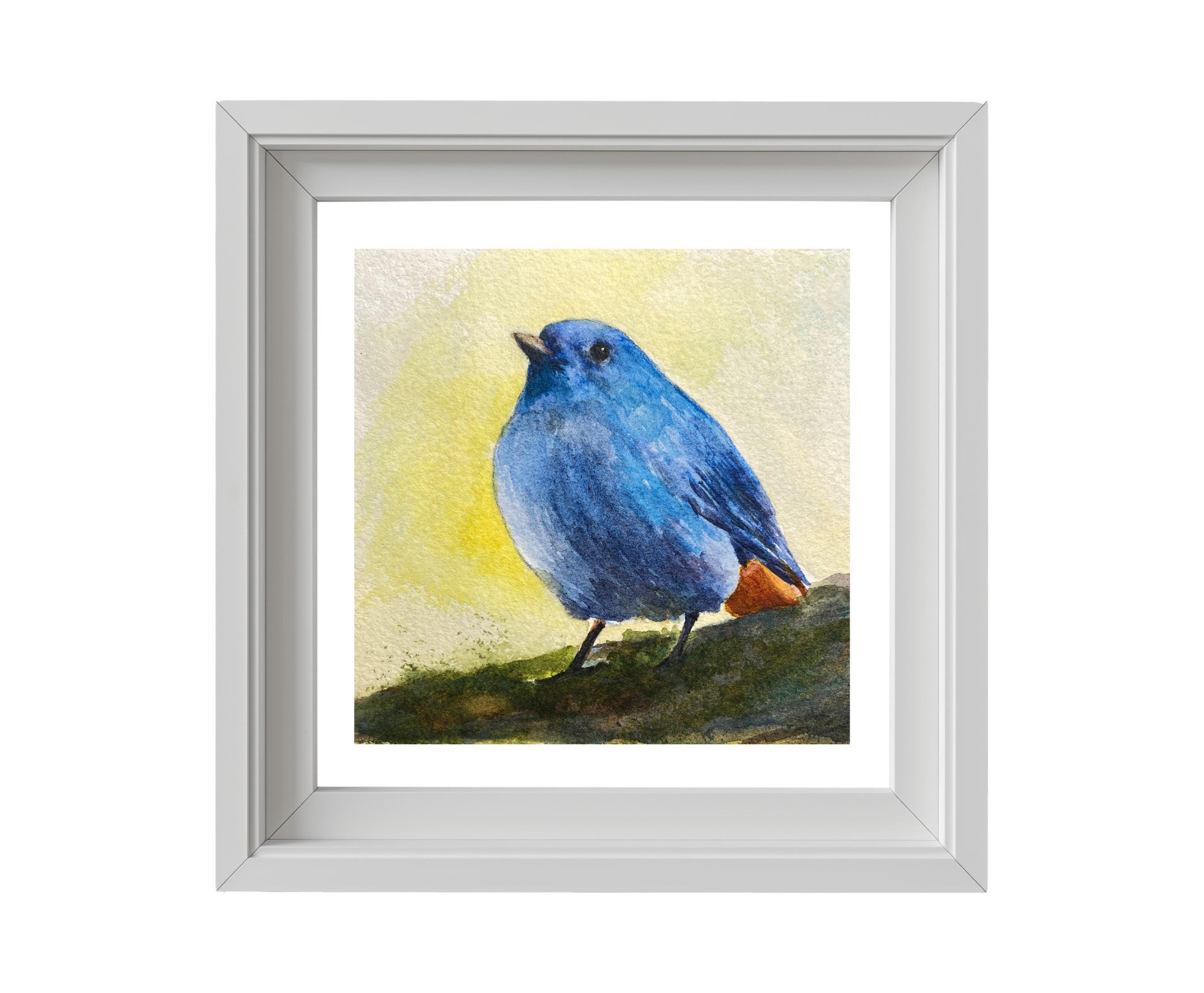 This is a square print made from my original watercolor painting of a blue and orange tipped Redstart.