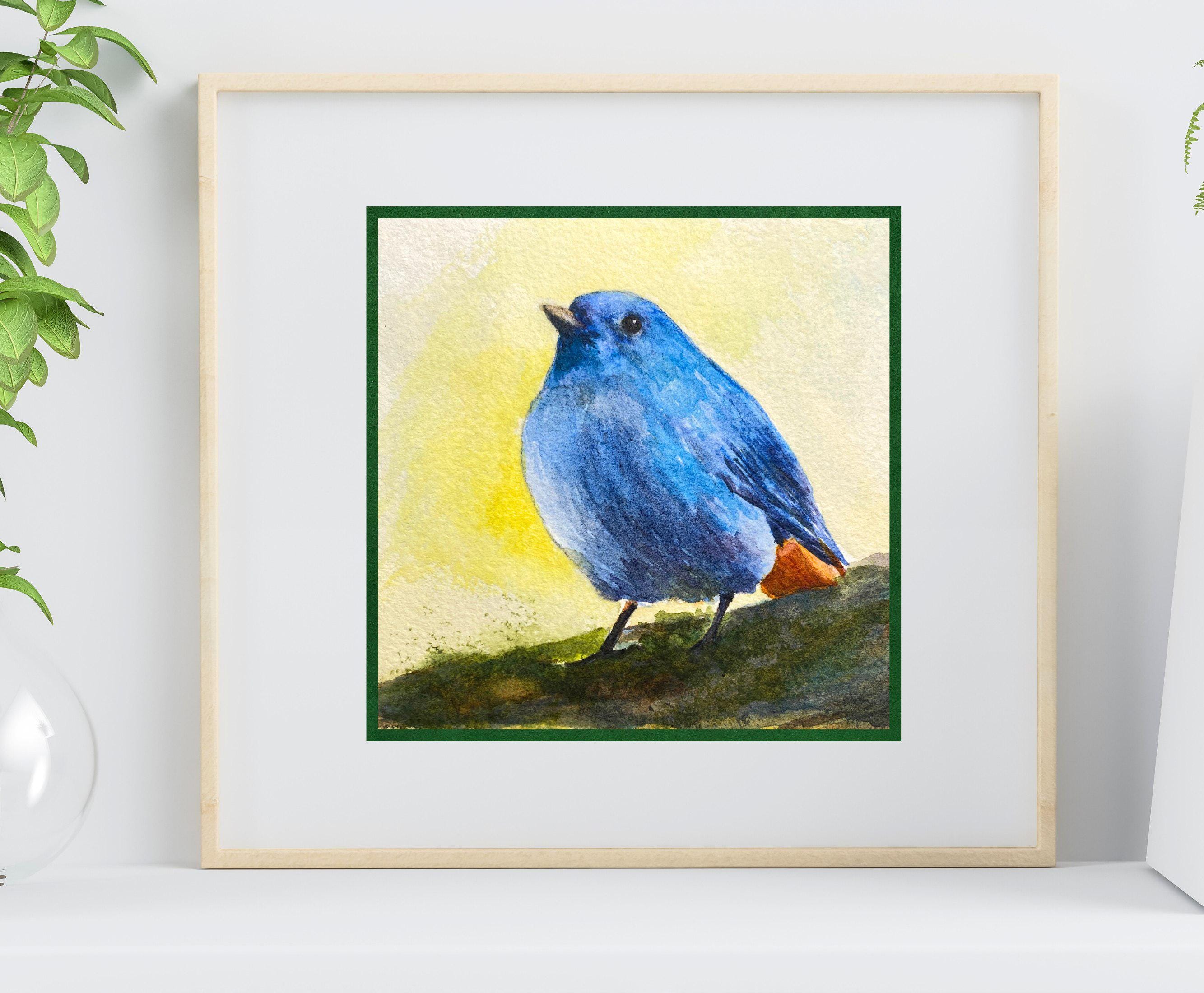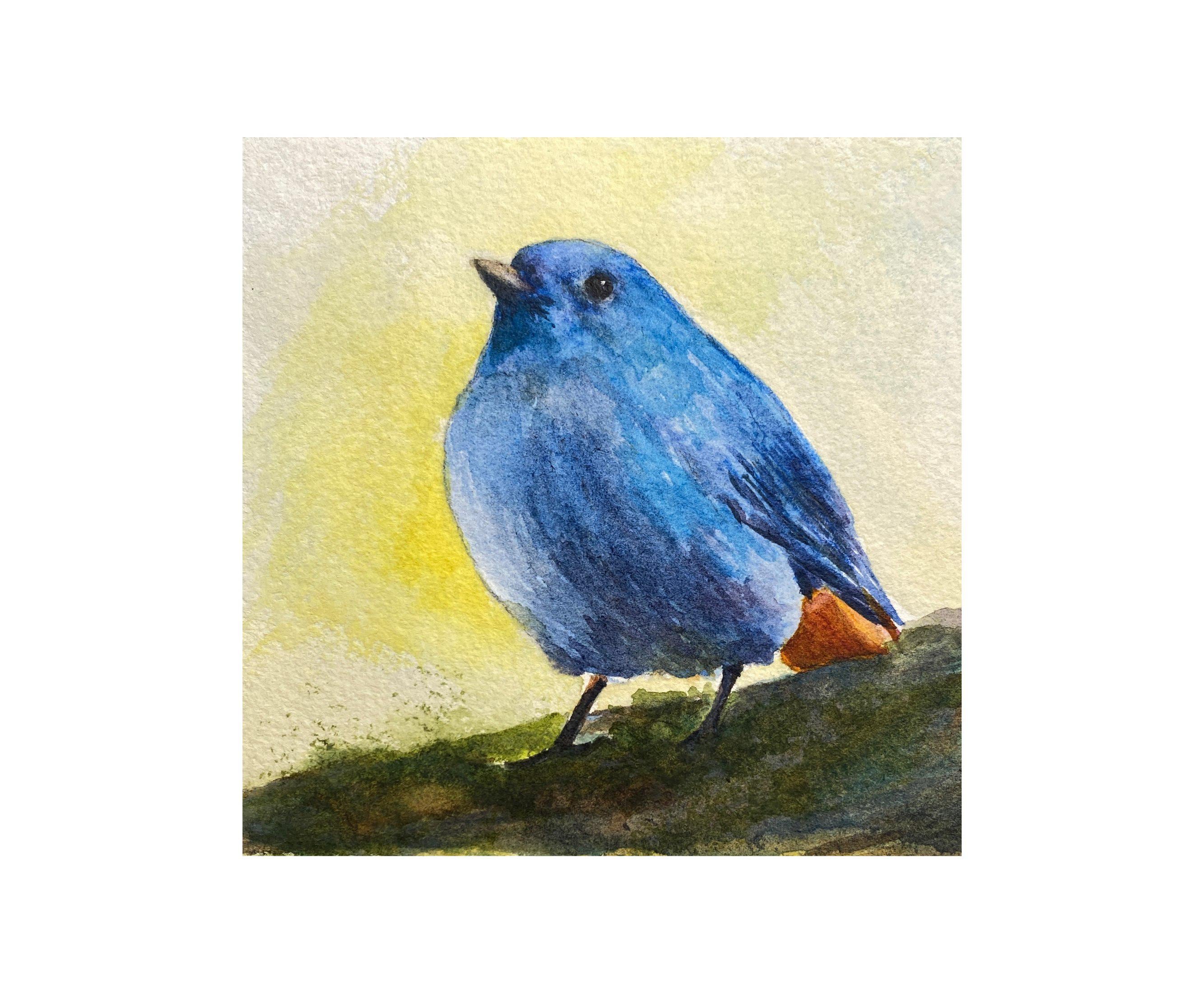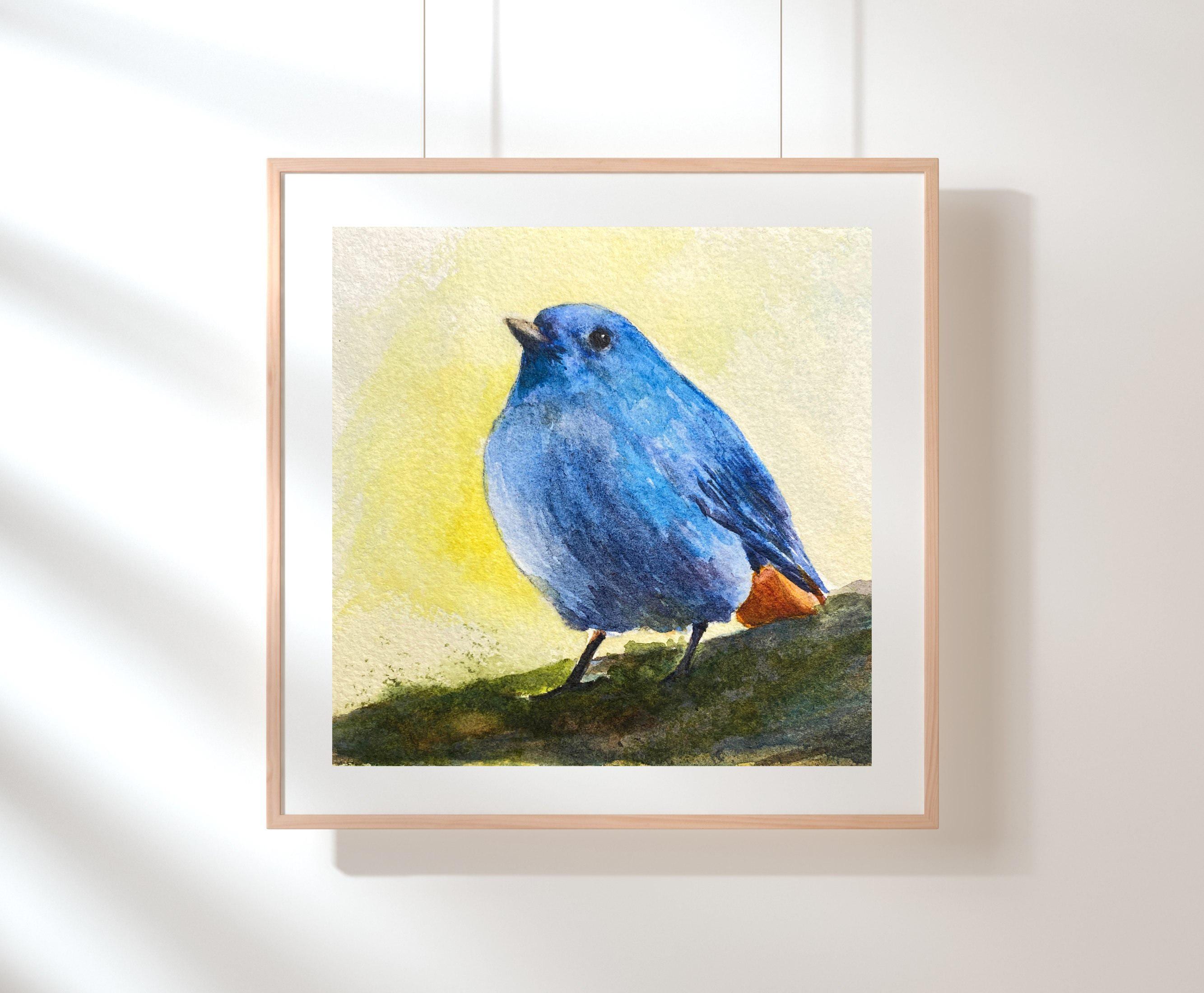 This is a square print made from my original watercolor painting of a blue and orange tipped Redstart.