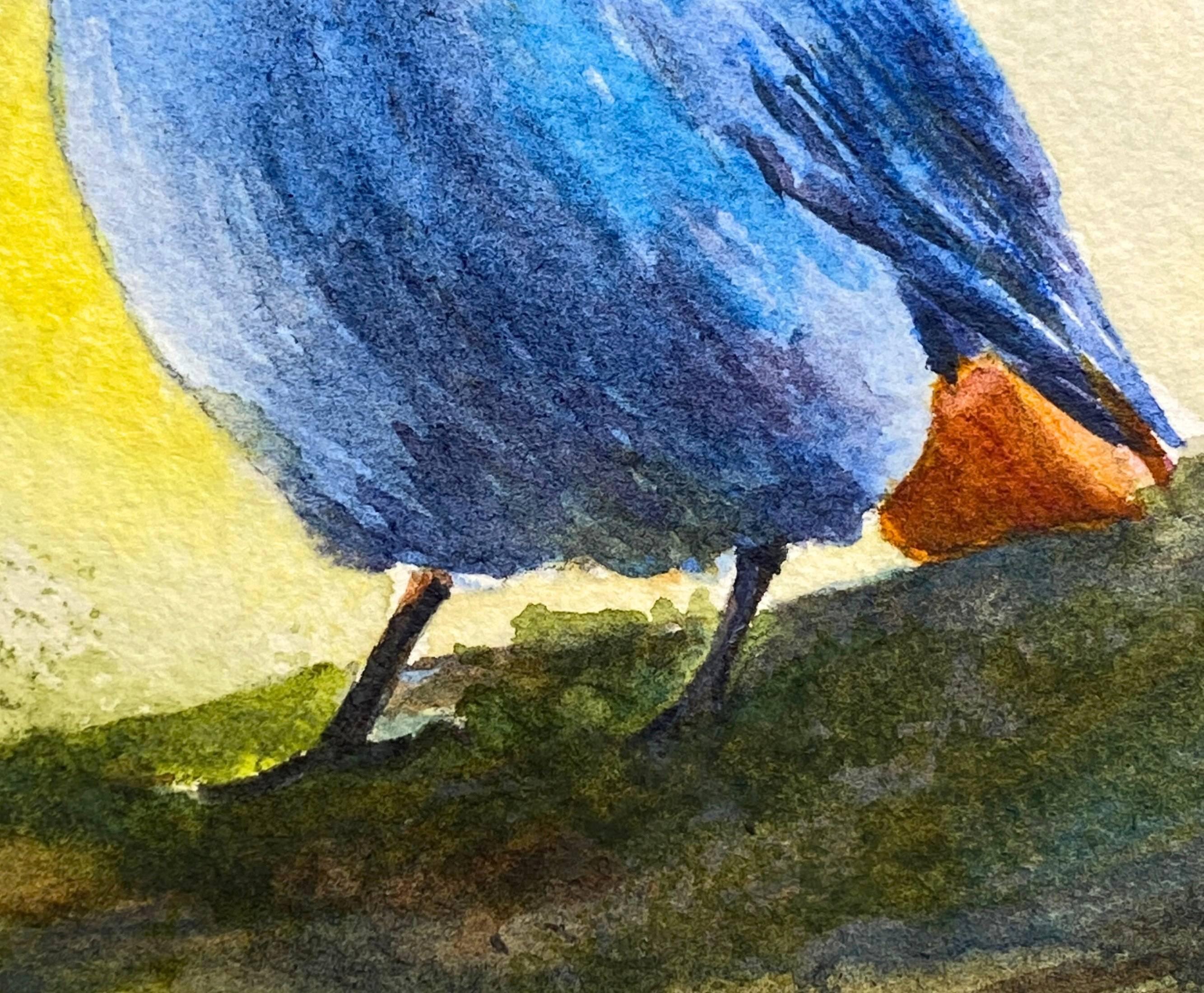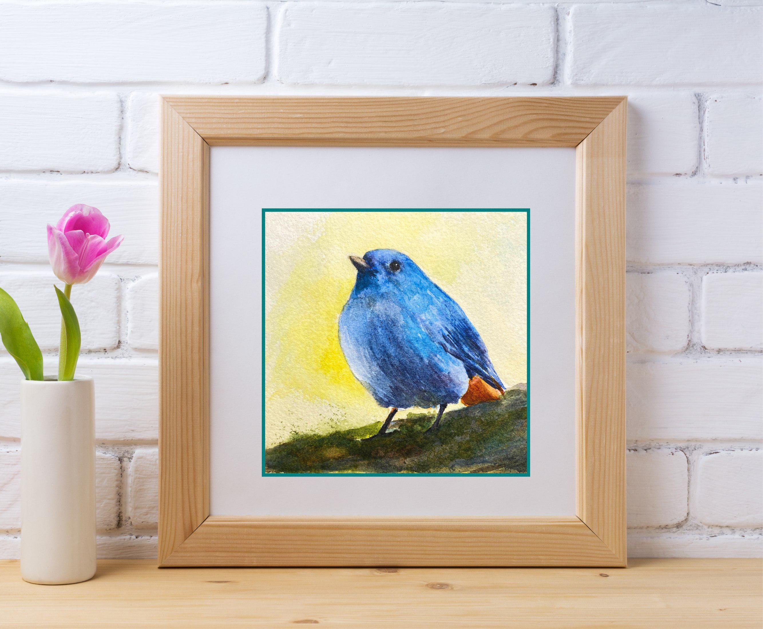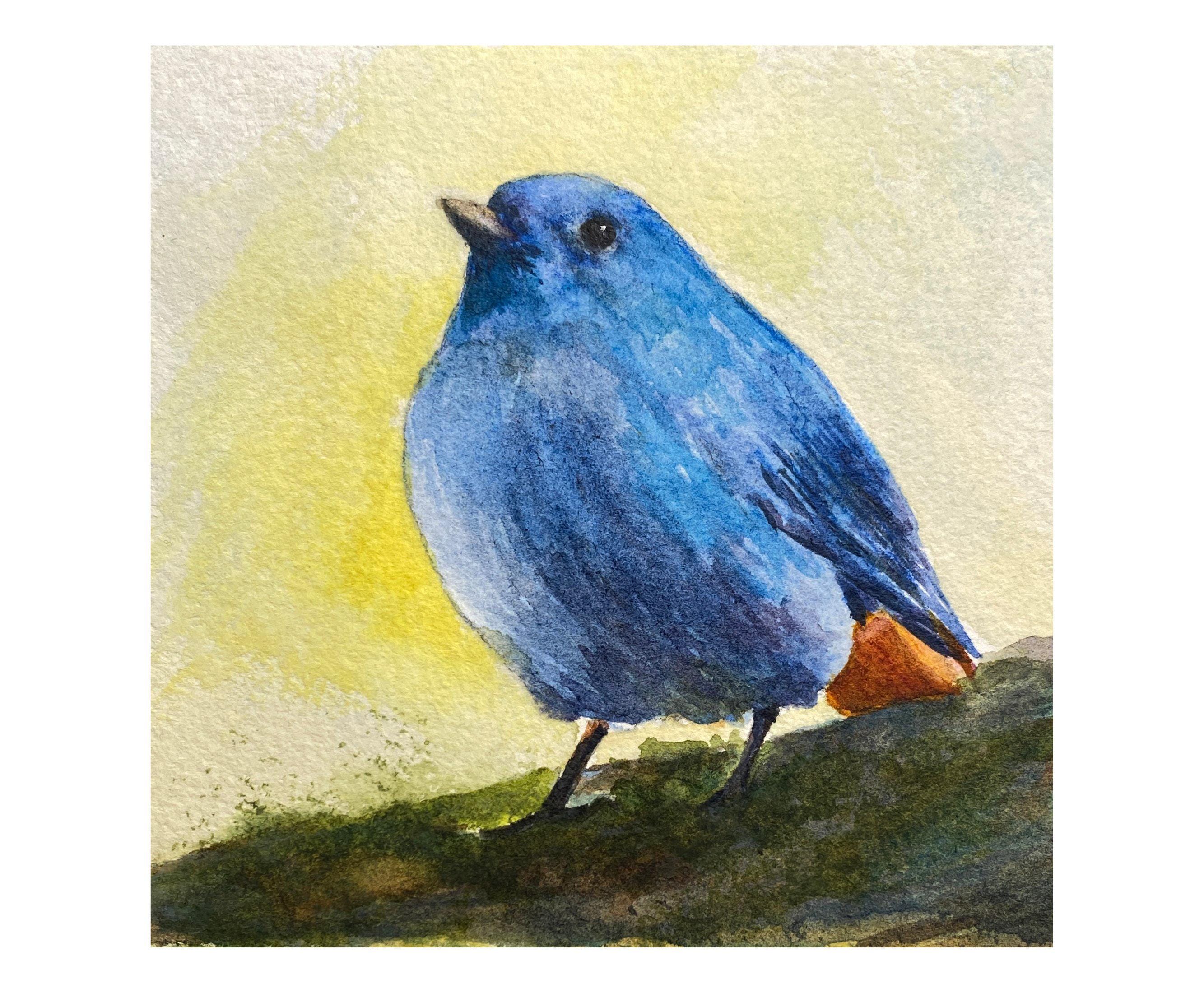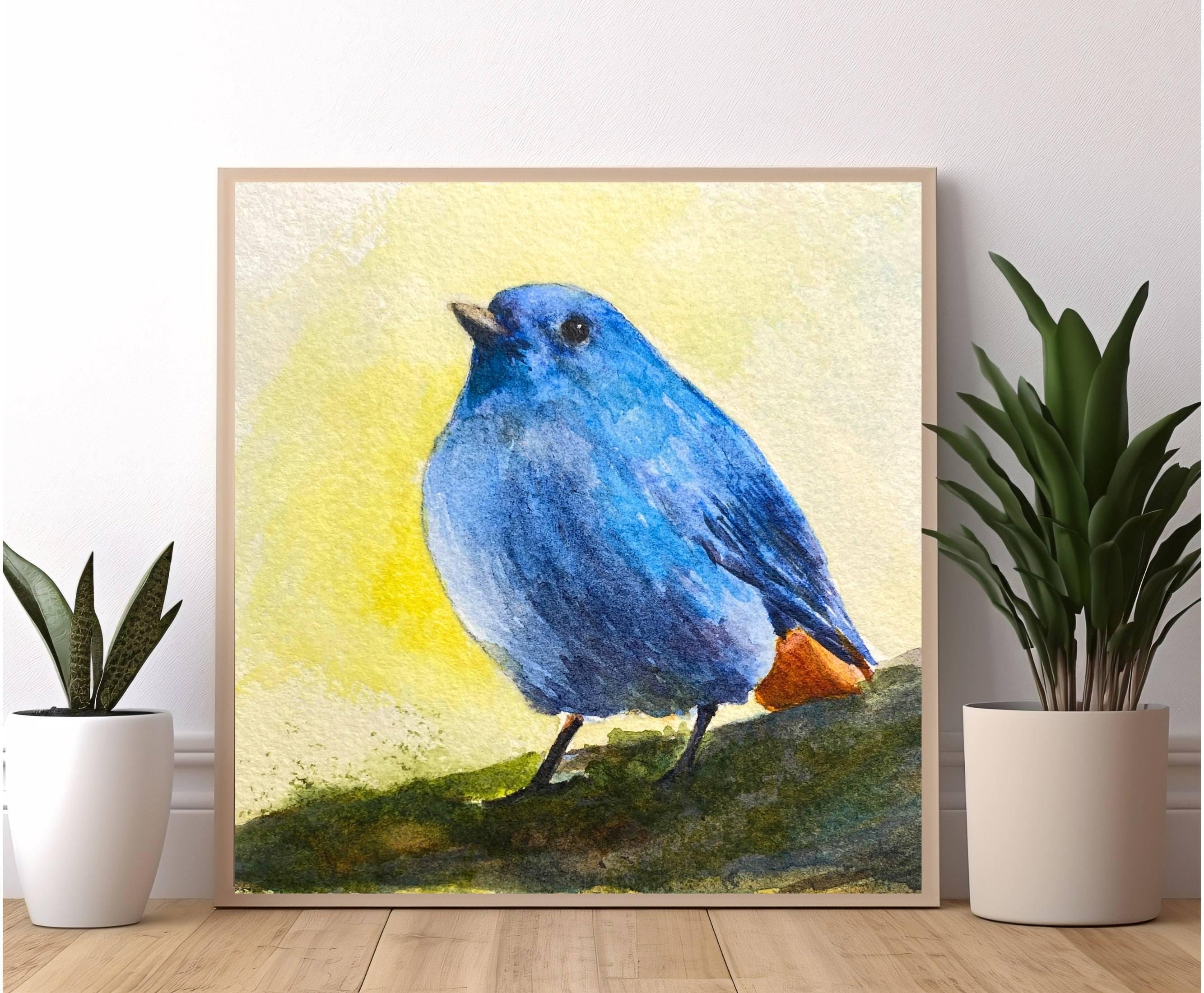 This is a square print made from my original watercolor painting of a blue and orange tipped Redstart.