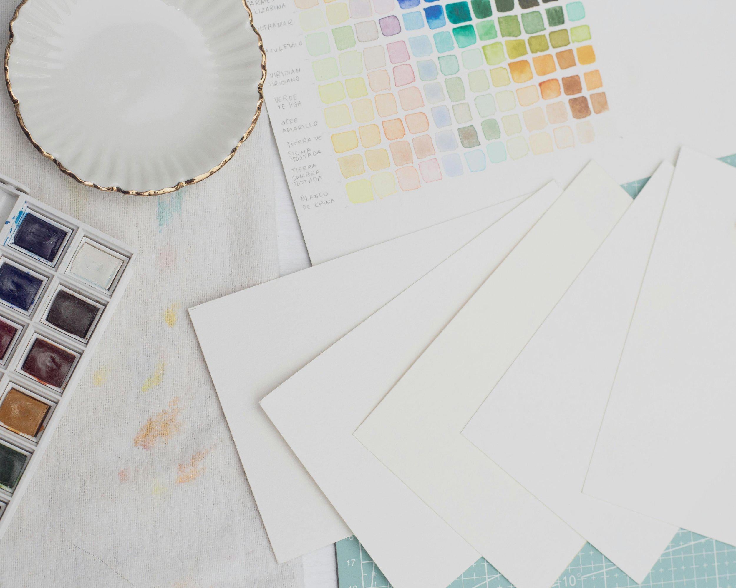 Bright white, matte art paper 230gsm. It is acid free and smooth. This is high quality art paper and makes beautiful prints.