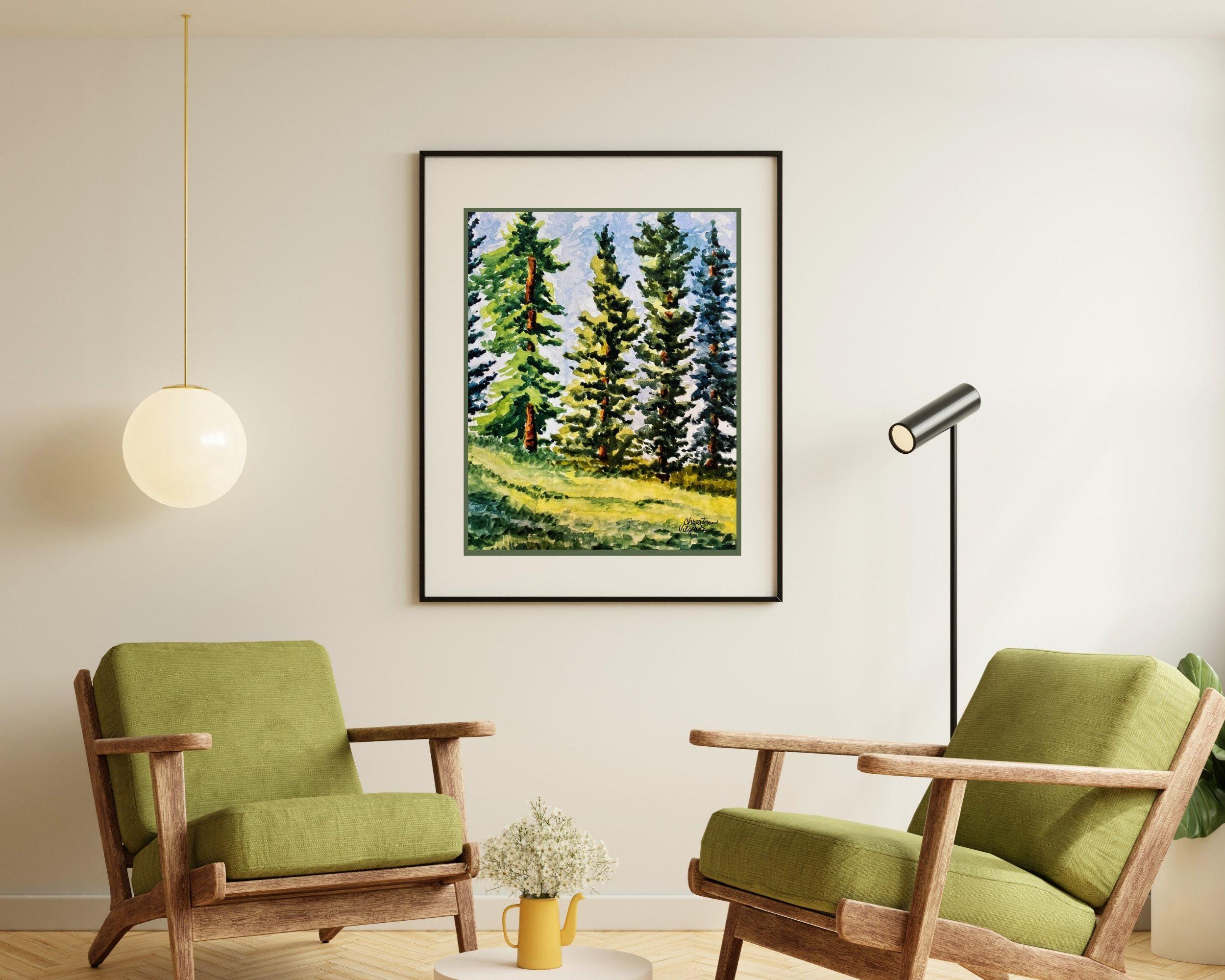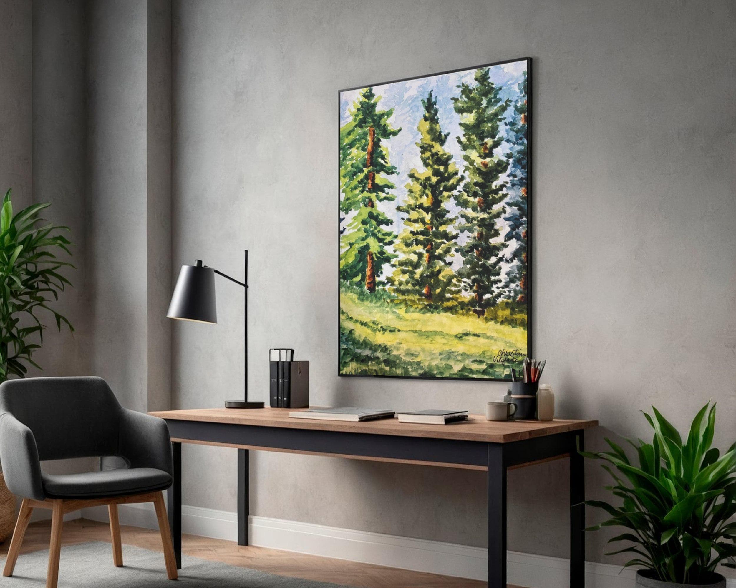 Add this stunning painting to your home and add a bit of nature to your rooms where you can imagine the soft breezes winding through these beautiful pine trees.