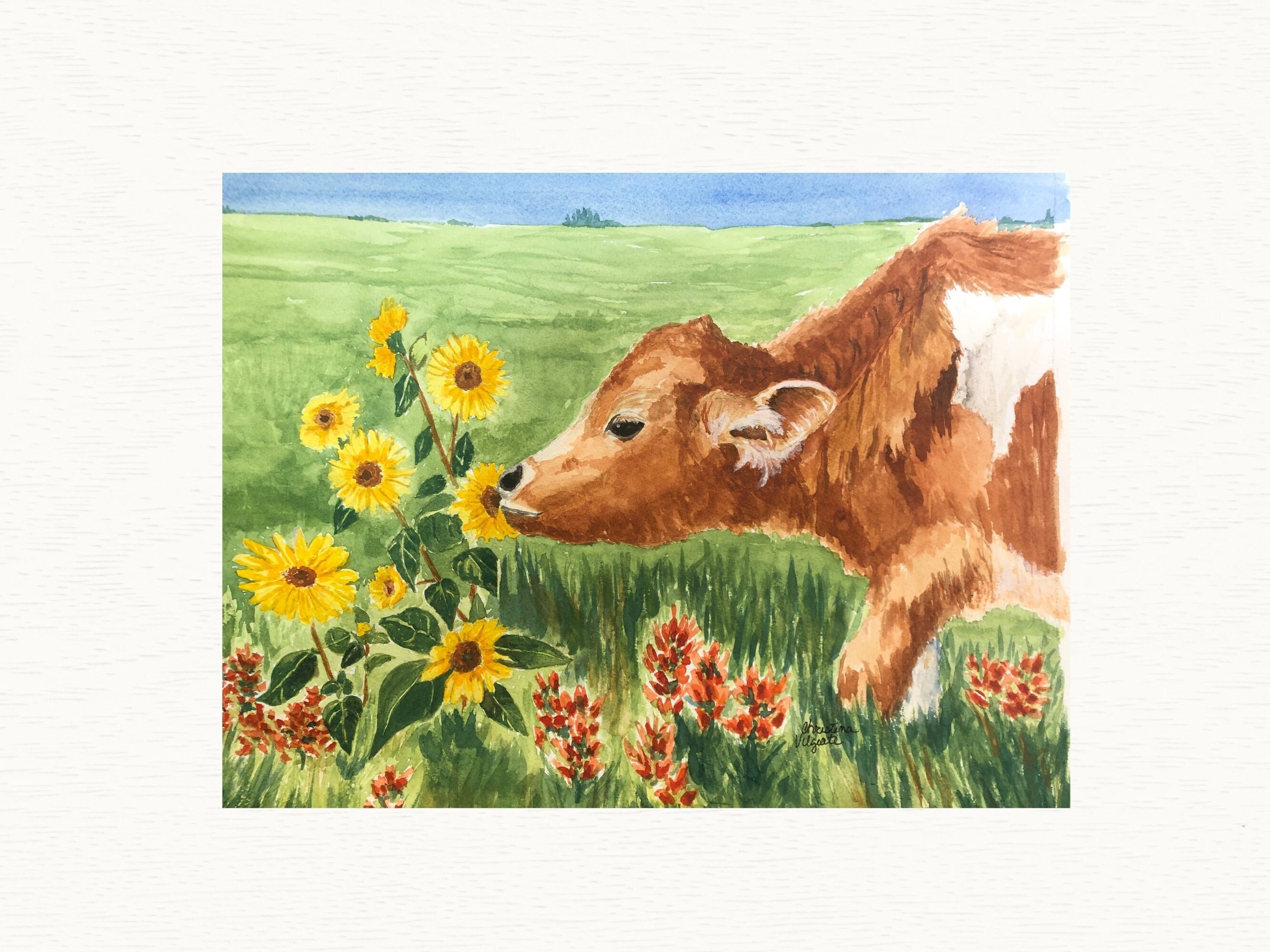 Art print from my original watercolor painting of a cute calf smelling some sunflowers- titled ‘Wonder’ Whether you hang it in a bedroom, nursery or living room this painting is sure to bring smiles and delight.