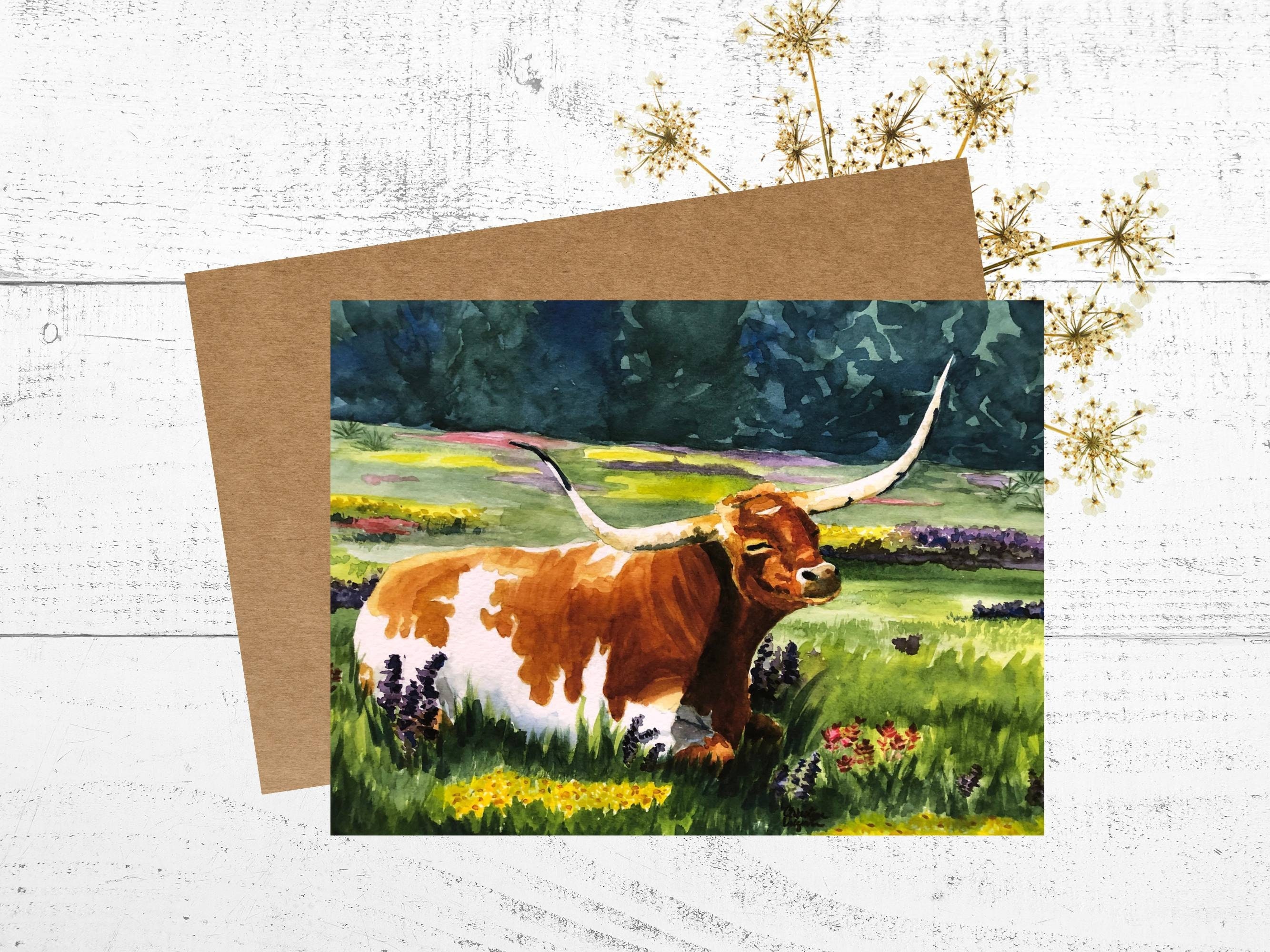 This listing is for greeting cards made from my original watercolor painting on paper titled "Tex, The Sleepy Longhorn".